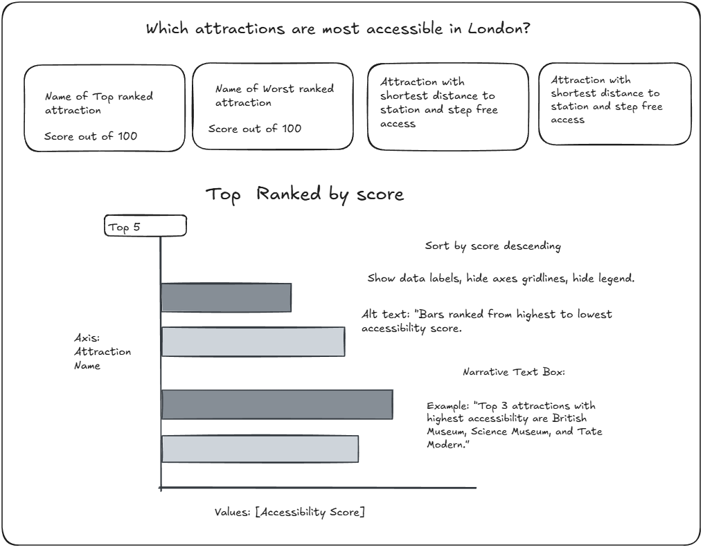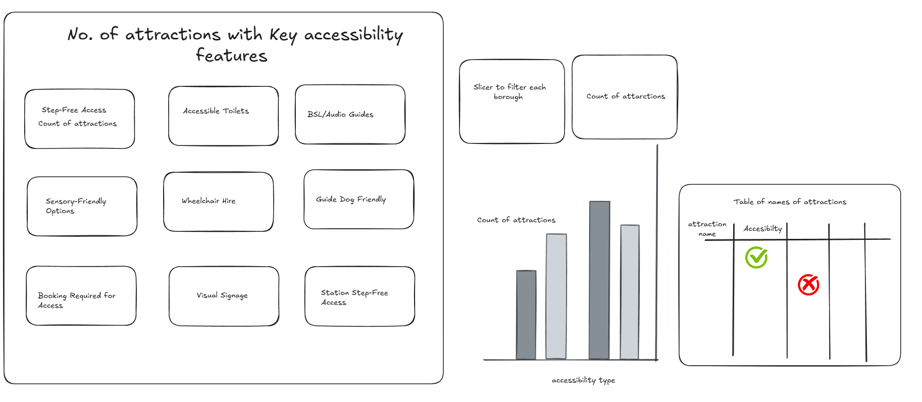 The main objective of the dashboard is to provide users with an overview of how accessible London attractions are, while also allowing them to drill down into the different accessibility types. This will help identify which accessibility features are lacking at certain attractions and highlight areas that can be improved.