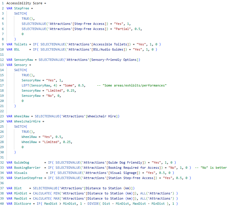 The ranking score, created using DAX calculations as a measure, took longer than expected. Instead of keeping it simple with a score of 1 for “Yes” and 0 for “No,” I decided to assign a unique score for each individual accessibility type. This incorporated different outcomes such as “Some” and “Limited,” and a hierarchy of types was developed to form a weighted sum for the final accessibility score.