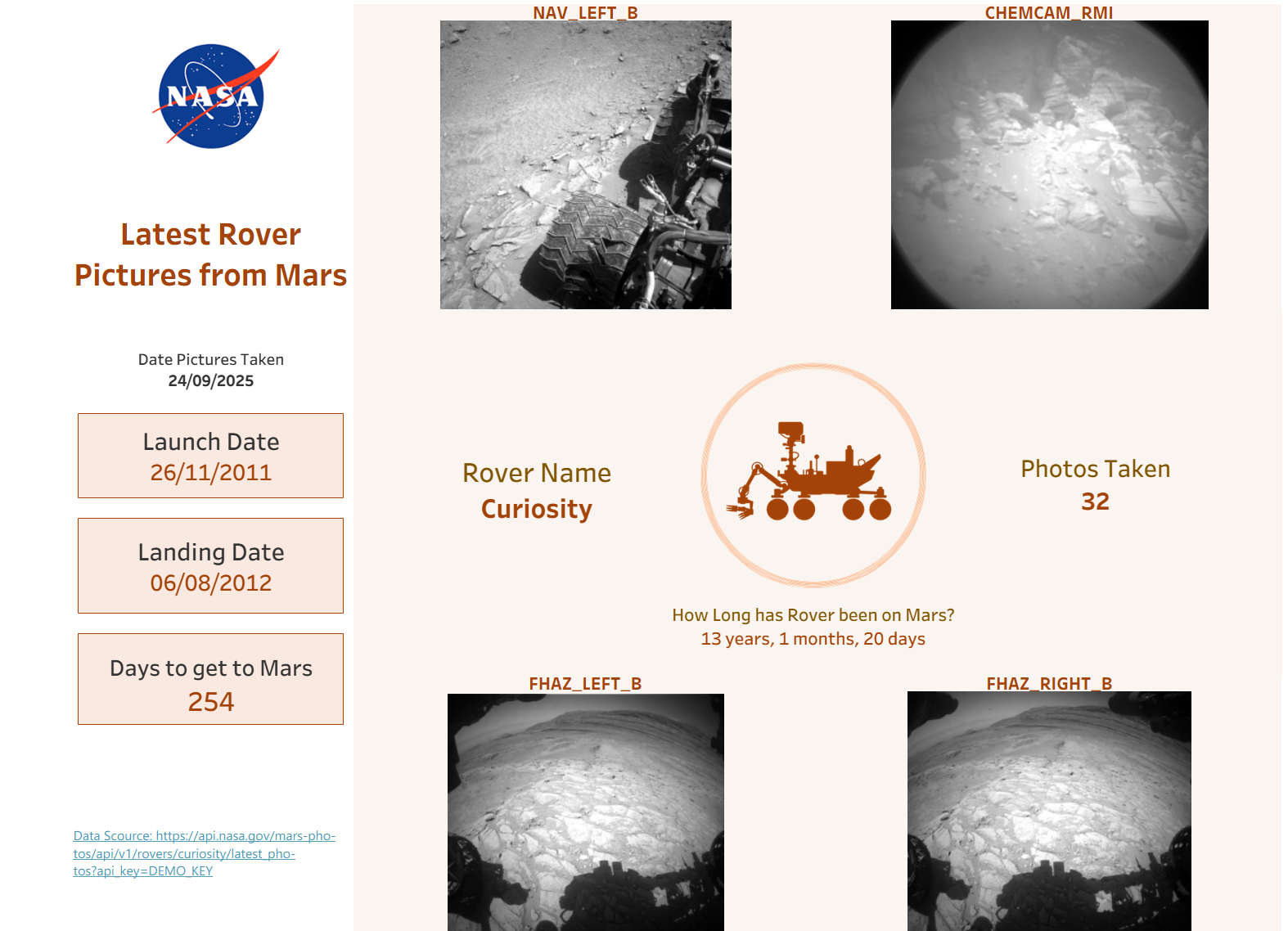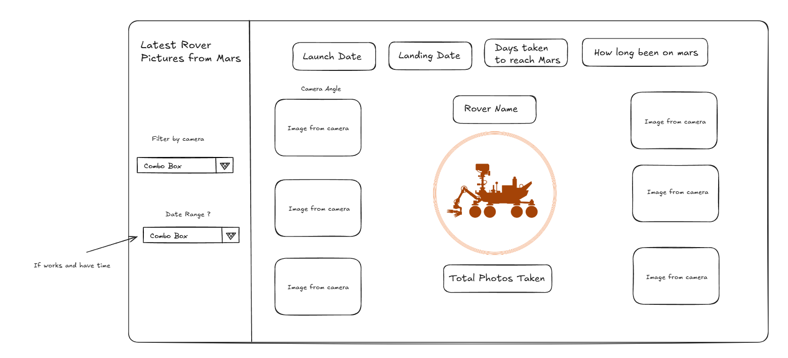 With more time, I’d expand the dataset to include multiple rovers and wider date ranges, add a toggle parameter so users can cycle through multiple images per camera angle, and integrate a Mars weather API to show temperature, pressure, wind, and dust for each photo’s date and location so viewers see both the image and the conditions on Mars at that moment.
