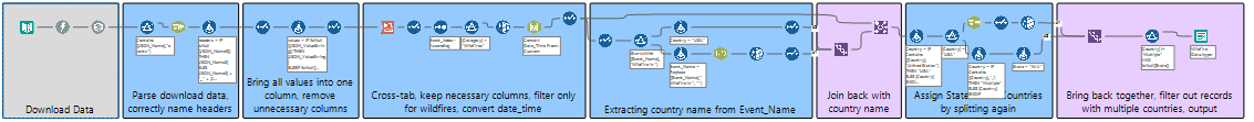 Using Alteryx, I pulled in the JSON data from the API and began to wrangle it into a more structured format. Each wildfire event includes metadata such as the date, location coordinates, and relevant categories. One of the early challenges was enriching the dataset with geographic context — specifically extracting country names from the coordinates and, for the United States, assigning states to each event. This additional detail opened up a more insightful analysis of geographic distribution.
