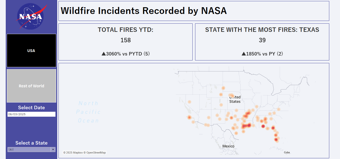 - Wildfires in the Rest of the World – Intended to mirror the structure of the USA view, showing country-level data and a temporal breakdown.