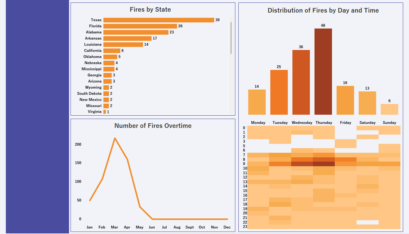 - Wildfires in the USA – A detailed view showing how wildfire events are distributed across US states and how they’ve changed month by month.